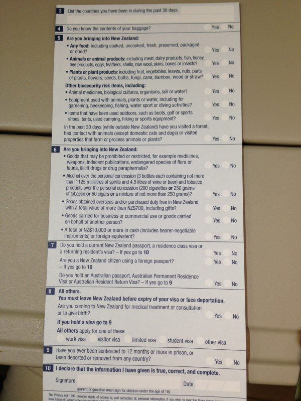 网友H:① 奥克兰入关前,在飞机上已经填报了申报单。入关的申报检查也没有像网友和官网说的那么可怕和严苛,只要对问到的物品是否有带老实申报就是,不要隐瞒。