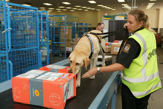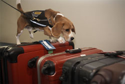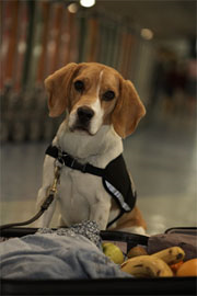 如果你的行李内有食物,农林处工作人员会询问。如果你的行李内没有食物,但之前装过食物,嗅犬还是会嗅到的,所有情况如实告知。除了农林处外,海关也有缉毒犬在附近工作。海关人员的制服是海蓝色的,农林处的是米黄色的。农林处的嗅犬是比格猎犬,就是小孩子看到都觉得超可爱的狗狗;海关的是黑色的大狗。两种狗都不能触摸,下面给出狗狗照片(笑)。